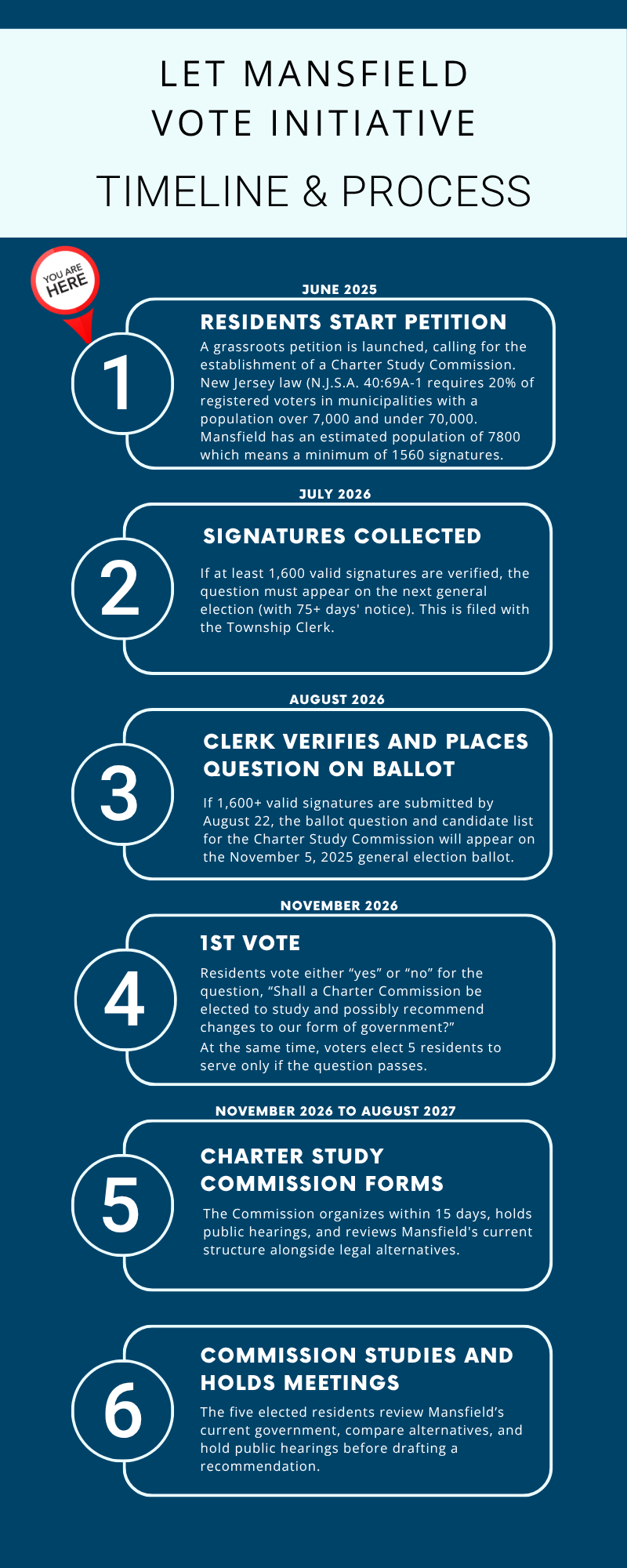 Mansfield Township currently operates under New Jersey’s oldest form of government: the Township Form, established in the 1790s. Under this outdated structure, five committee members are elected by voters, but they, not you, choose the mayor in a private reorganization meeting.
