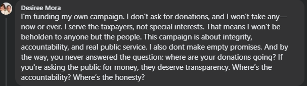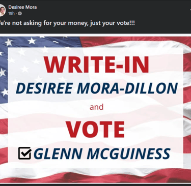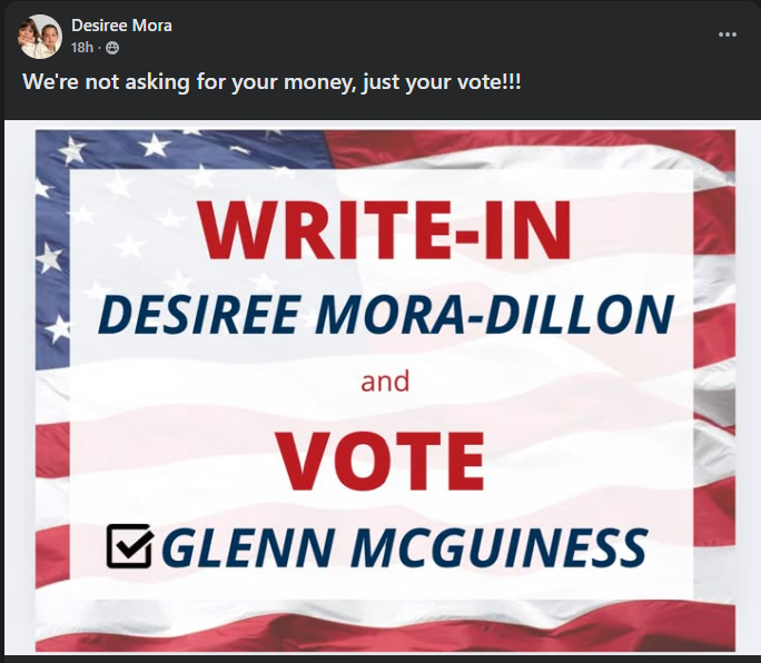 At the same time, the candidate, Desiree Mora-Dillon, has made public claims on Facebook stating: