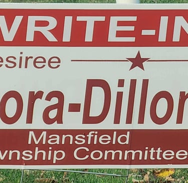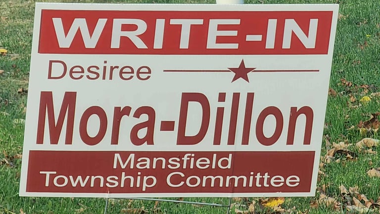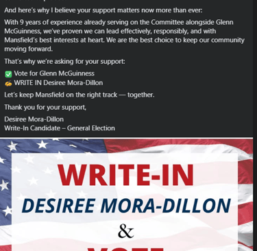 Over the past few weeks, new red “WRITE-IN Desiree Mora-Dillon” signs have appeared throughout Mansfield. These signs feature various styles and materials, including yard signs and banners, and appear professionally printed, except that they are missing the required "Paid for By" disclaimer.