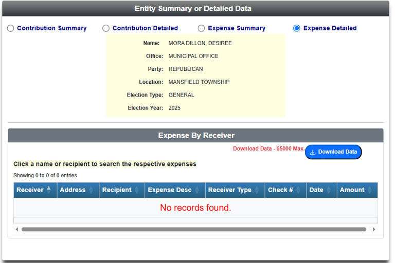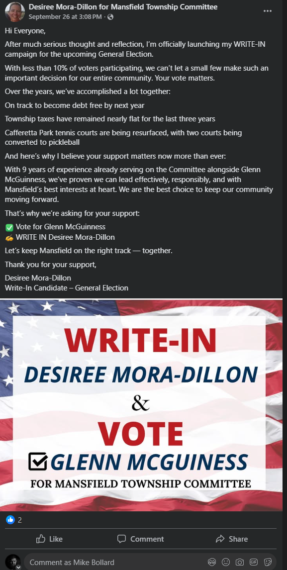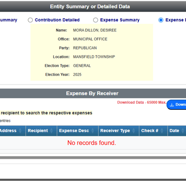 The 29-day pre-election report for the 2025 General Election was due on October 6, 2025. However, a public search of the ELEC database on October 9, 2025, shows no recorded campaign expenses for Desiree Mora Dillon, despite the visible printing and distribution of campaign materials across the township. It has been an ongoing pattern with this campaign, as you can see in other campaign materials shared digitally on social media and township groups that are also missing the required disclosure statement of "Paid for By:".