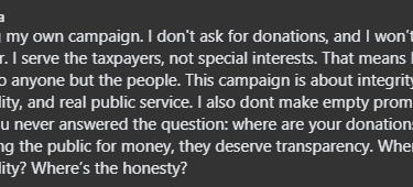 “I’m funding my own campaign. I don’t ask for donations, and I won’t take any, now or ever. I serve the taxpayers, not special interests.”